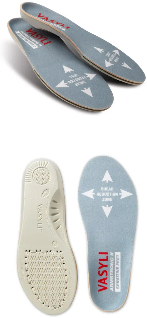 The VASYLI + Armstrong II sensitive feet orthotic is suitable for patients who suffer from plantar sensitivity—loss of plantar fat pad, arthritis, and blistering, as well as peripheral neuropathy. It’s clinically and scientifically validated to reduce shear forces and the incidence of plantar ulcerations compared to standard diabetic insoles.
